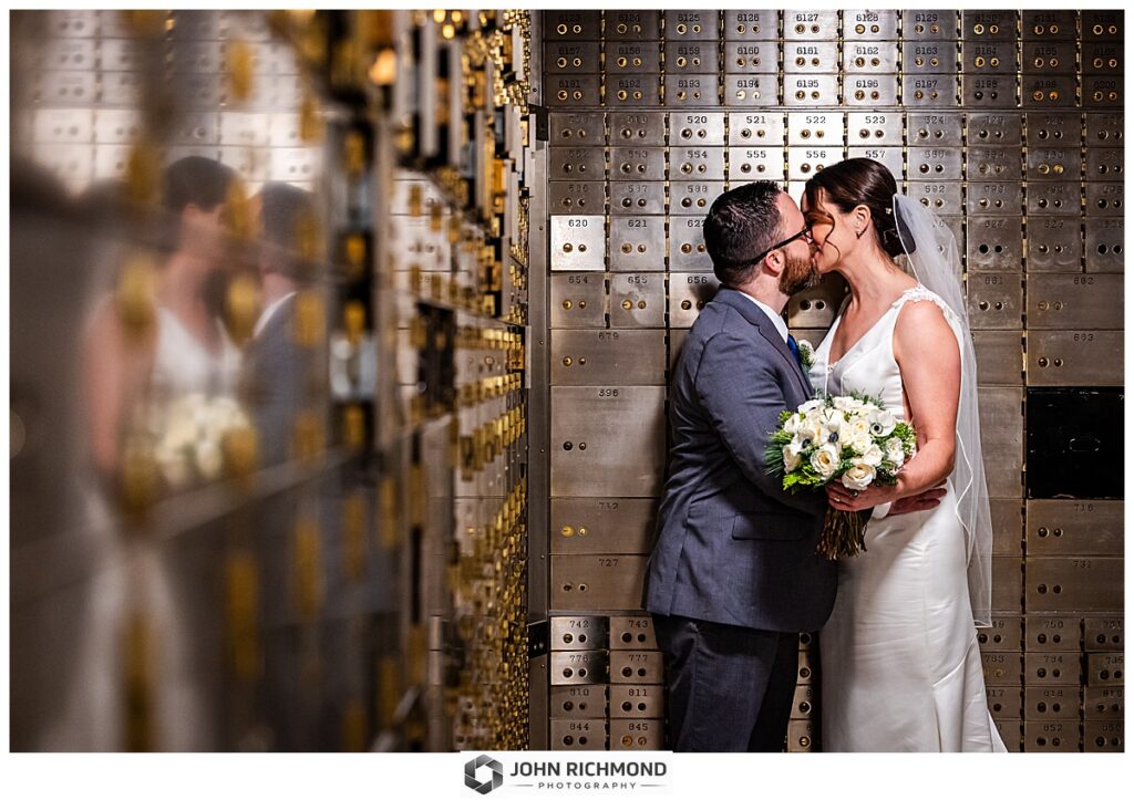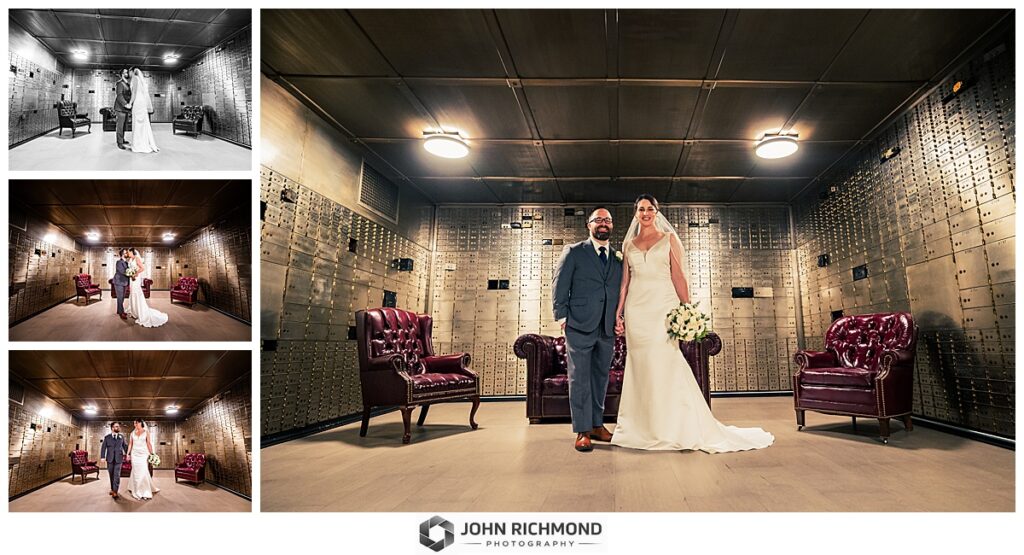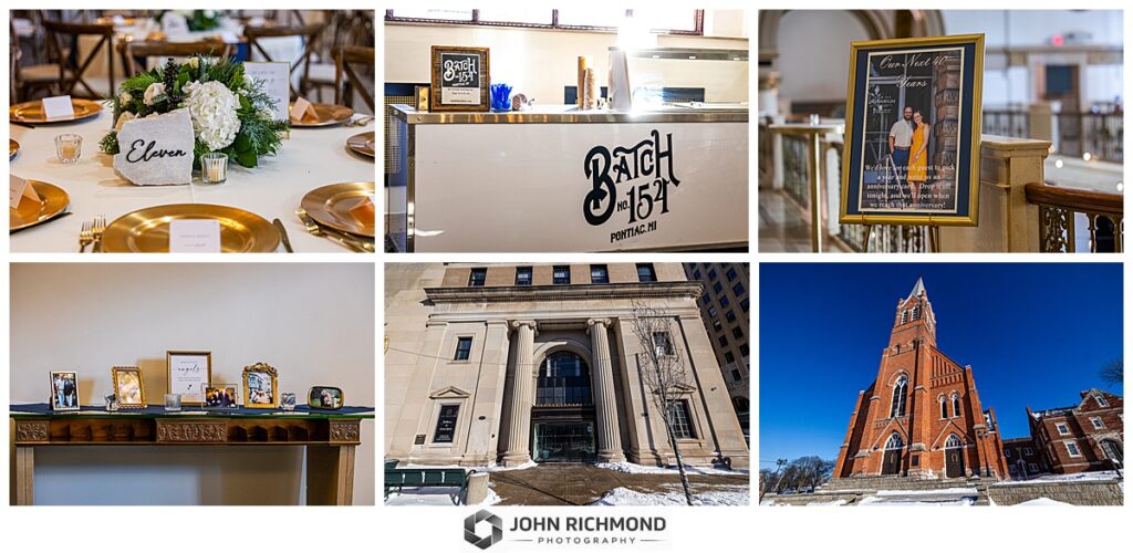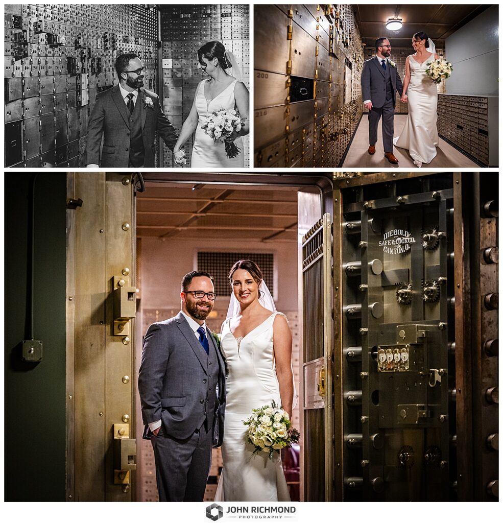 From there, we made our way to The Treasury, where Carolyn and Steven shared one of the most memorable moments of the day: their first look in the historic basement vault. Once a functioning bank vault from the early 20th century, The Treasury is a restored neoclassical building that originally served as one of Pontiac’s financial landmarks. With its marble details, soaring ceilings, and preserved architectural elements, the space blends timeless history with modern elegance. The vault itself, tucked beneath the building, carries an undeniable sense of character—making it the perfect, intimate setting for such an emotional first look.