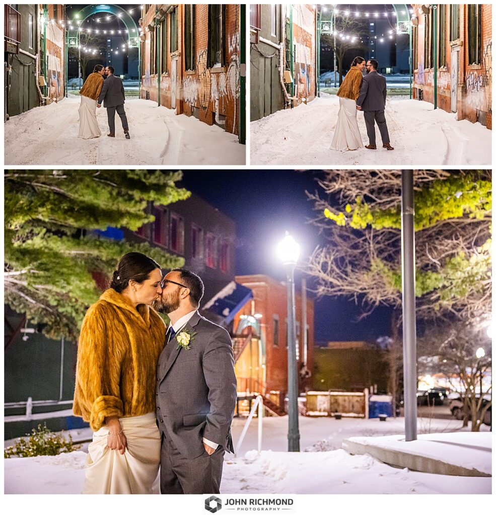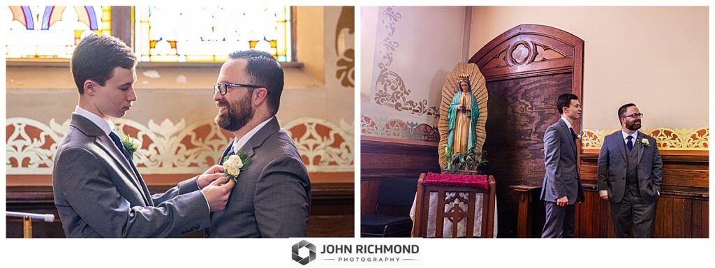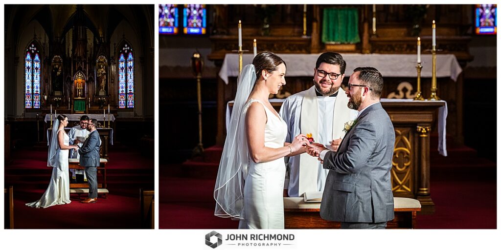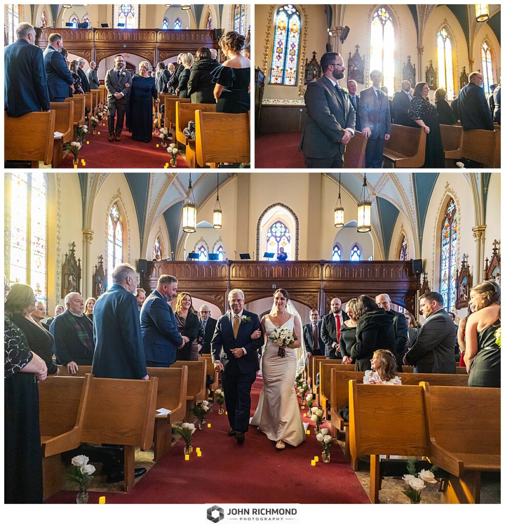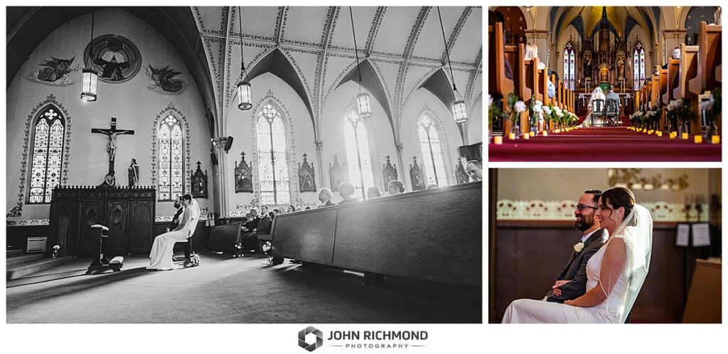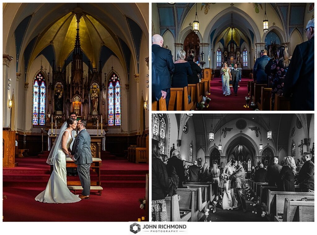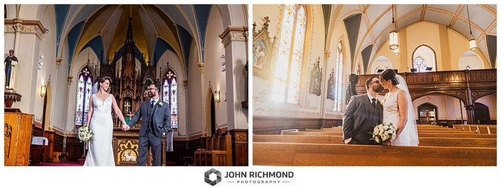 Afterward, we stepped outside for a few photos near the Strand Theatre, taking advantage of Pontiac’s historic charm before heading to St. Vincent de Paul Church for the ceremony. Despite the cold January air, the day surprised us all with brilliant sunshine. As the sun poured through the church windows, it created the most stunning light—truly the kind photographers and couples dream of. The warmth of the light paired beautifully with the heartfelt vows, making the ceremony feel even more sacred and unforgettable.