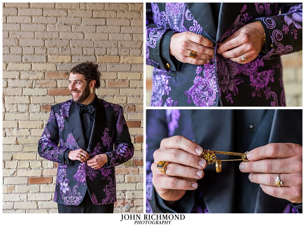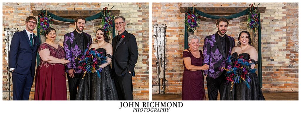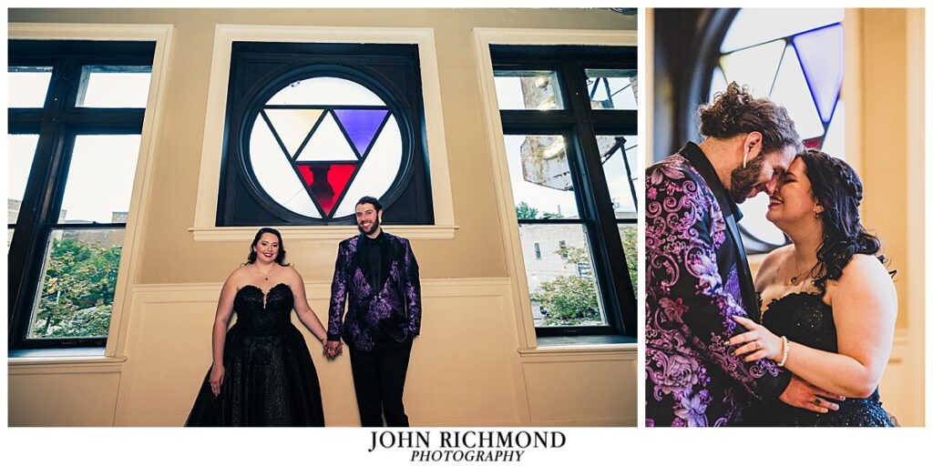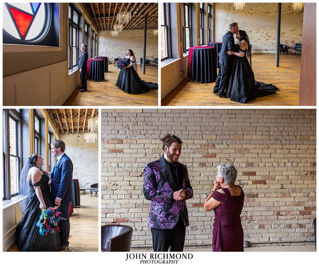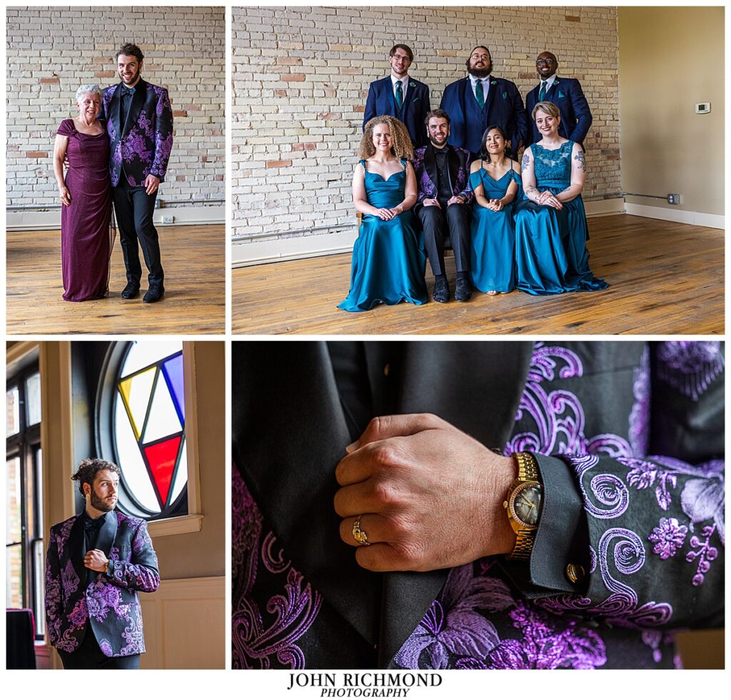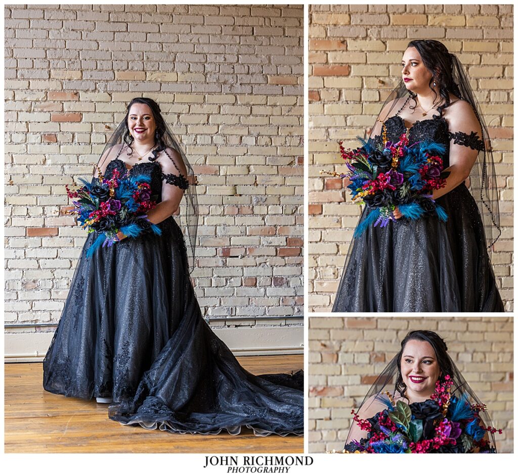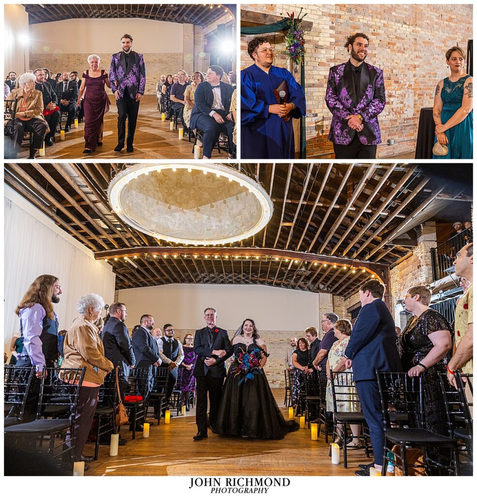 One of my favorite parts of the day was Savannah’s bold and stunning choice of a black wedding dress. She looked absolutely incredible and brought such a modern, elegant twist to the day. Patrick matched her style perfectly with his black suit coat accented in purple—a combination that made them stand out beautifully against the character of the Harris Building.