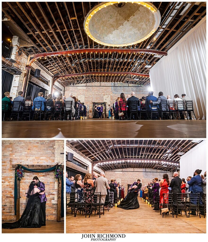 The ceremony itself took place in the heart of the Historic Harris Building. The exposed brick and old theater lighting created such an intimate, timeless atmosphere. Savannah and Patrick exchanged their own written vows, and it was one of the most touching parts of the day. Their words were heartfelt and personal, leaving not a dry eye in the room. The ceremony ended with a perfect kiss and a playful dip at the end of the aisle—a moment that captured their personalities so well.